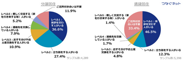 ただし、理想的なご近所付き合いの程度としては分譲・賃貸ともに「レベル1:挨拶を交わす人がいる」と回答した人の割合が一番多く、分譲では36.6%、賃貸では46.5%に。マンションにおいては、一定の距離を保ったご近所付き合いが求められており、なかでも賃貸はその傾向が顕著です。