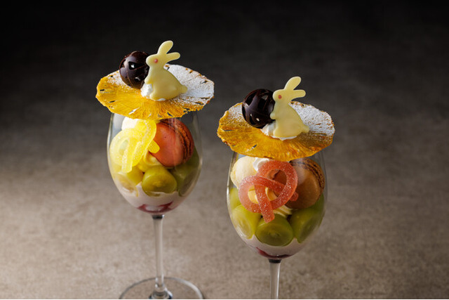 人と人とを結びつけるという意味がある水引を模したパート・ド・フリュイ(*1)や縁結びの神様、白うさぎ(*2)型のホワイトチョコレートを使用したホテル特製「開運パフェ」を提供します。パート・ド・フリュイの柔らかな食感や、金運と幸運のシンボルと言われるパイナップルのドライフルーツの爽やかな酸味がアクセントとなり、最後まで味わいの変化を楽しめるスイーツです。彩り鮮やかな盛り付け、白うさぎのチョコレートのトッピングなど、見た目にも会話が弾む一品です。