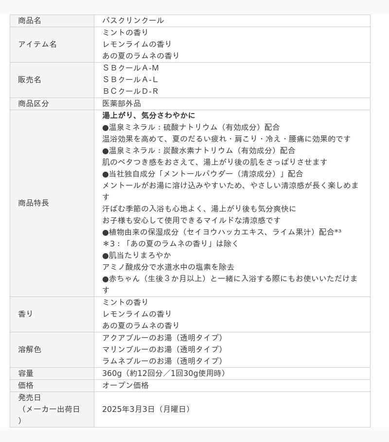 株式会社バスクリン(本社:東京都千代田区 社長:三枚堂正悟)は、本年で50周年を迎えたクールタイプ入浴剤「バスクリンクール」を、お客様のニーズに合わせたサイズ感と3つの新しい香りで3月3日(月曜日)より新発売いたします。