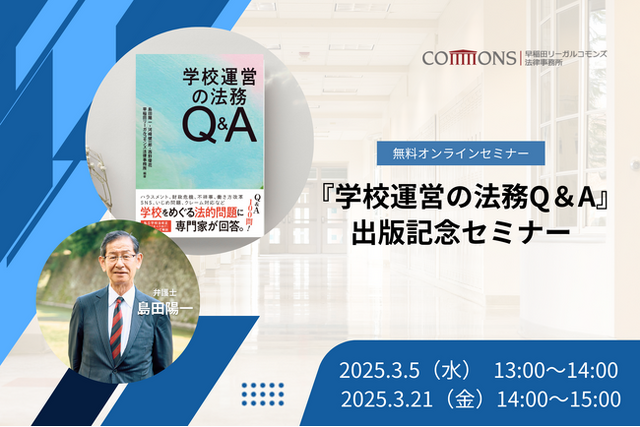 早稲田リーガルコモンズ法律事務所・学校法務センターは、新刊 『学校運営の法務Q&A』(旬報社) の刊行を記念し、2025年3月5日(水)13時~14時・21日(金)14時~15時学校法人の運営や教育現場の課題を取り上げる無料オンラインセミナーを開催いたします。