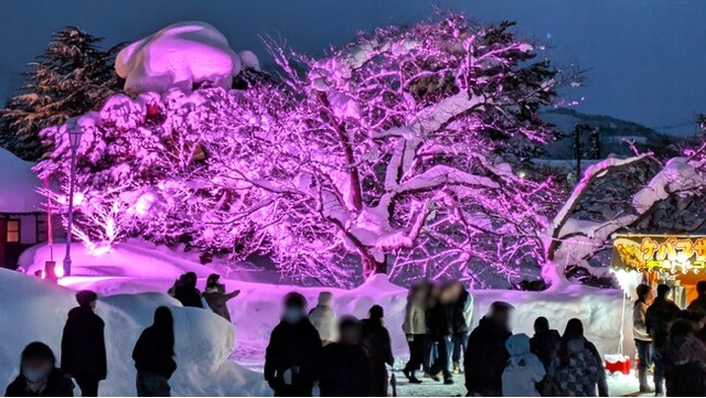 大雪が降り積もる中でのライトアップとなりましたが、ピンク色に照らされた桜の木々と雪が、まるで満開に咲き誇った桜のように、美しい姿となりました。風に舞う雪もまるで桜吹雪のよう。足を止めて、写真を撮影する方々の姿を多く目にすることができました。