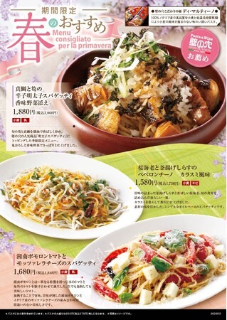 和風スパゲッティの元祖「壁の穴」では春のおすすめスパゲッティ3種類を3月3日(月)より期間限定で販売いたします。春の到来を感じる旬な食材・真鯛と筍に定番の辛子明太子の旨みとさっぱりした香味野菜の風味を引き立てた「真鯛と筍の辛子明太子スパゲッティ 香味野菜添え」。薄桃色の日本の春の風情ただよう桜海老と釜揚げしらすにカラスミの旨みを加えた「桜海老と釜揚げしらすのペペロンチーノ カラスミ風味」。加熱することで旨み、甘味が増した湘南ポモロントマトとモッツァレラチーズの組み合わせがやみつきになる「湘南ポモロントマトとモッツァレラチーズのスパゲッティ」でございます。この機会に是非ご利用ください。皆さまのご来店をスタッフ一同お待ちしております。