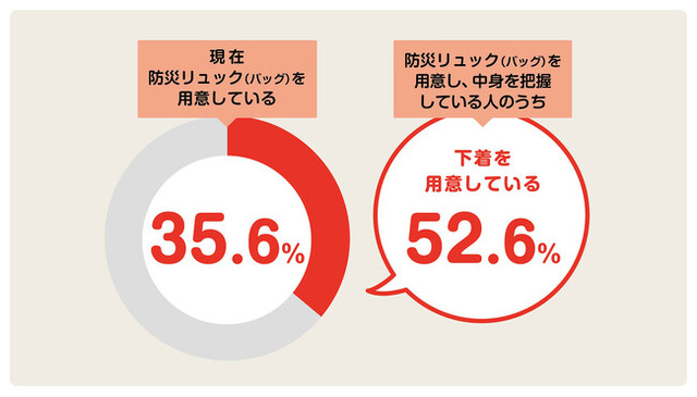男女計18,271名に対して「あなたは防災リュック(バッグ)を現在用意していますか?」と調査したところ「防災リュック(バッグ)を用意している(35.6%)」が「防災リュック(バッグ)を用意していない(64.4%)」を大幅に下回りました。また、防災リュックを所持し、中身を把握している人の中で「下着を用意している」は52.6%にとどまり、アンケート回答者全体のうち、防災リュックの中身を把握し下着まで用意している人は10.9%という結果に。快適で清潔な生活に不可欠な下着が十分に備えられていない実態が浮き彫りになりました。