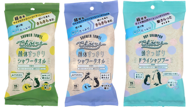 「CHOIフキー 頭さっぱりシャワータオル サボンの香り」は、入浴できない時に使えるドライシャンプーです。ダイヤ柄の凸凹シート仕様で、髪や肌にやさしく、しっかり汚れを拭き取れる設計となっています。水分をたっぷり含みながらも、使用後は髪がさらっとまとまります。頭だけでなくからだにも使えます。