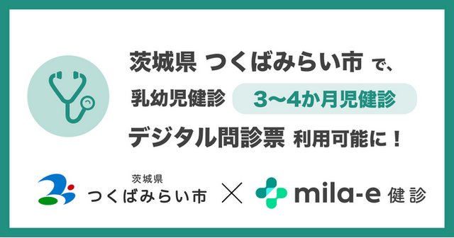 株式会社ミラボ(本社:東京都千代田区、代表取締役:谷川一也、以下「ミラボ」)は、乳幼児健診 デジタル問診票サービス「mila-e(ミライー) 健診」について、茨城県 つくばみらい市の3~4か月児健診において 運用を開始しました。