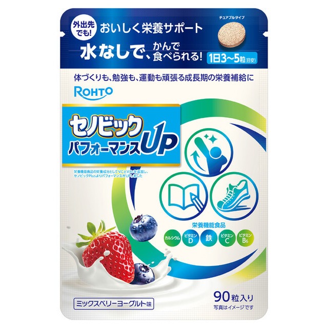 「セノビック パフォーマンスUP」は、ロート製薬が成長期の骨を研究して生まれた「セノビック」から提案する、栄養機能食品(カルシウム・ビタミンD・鉄・ビタミンC・ビタミンB6)です。成長期応援ブランドとして、新たに水なしでかんで食べられるチュアブルタイプが登場。