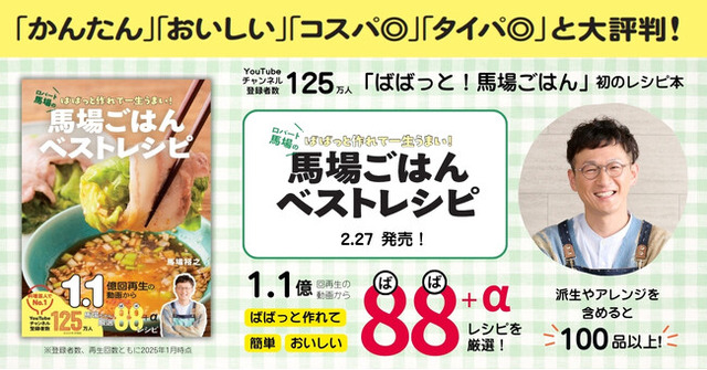 料理芸人として各メディアで活躍する「馬場ちゃん」ことロバート馬場裕之さんのYouTubeチャンネル「ばばっと!馬場ごはん」初のレシピ本『馬場ごはんベストレシピ』がいよいよ発売! チャンネルを開設した2020年から約5年にわたって公開してきた多数のレシピ動画から、馬場さんが厳選した「ベストレシピ」をまとめた1冊です。