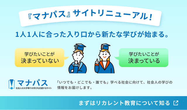文部科学省が運営する社会人の大学等での学びを応援するサイト 「マナパス」(以下、「本サイト」)を、2025年2月27日(木)より、これまでの利用者の多くの声を活かし、リニューアルオープンしたことをお知らせいたします。文部科学省では、「いつでも・どこでも・誰でも」学べる社会の実現に向けて、社会人の学びの情報を届けることを目的に令和2年に本サイトを開設しました。今回は、学びたい内容が明確に決まっている方だけでなく、まだ何を学ぶかは決まっていないがリカレント教育に関心がある方も含めて幅広い方々を対象に利用いただけるようリニューアルいたしました。利用者の皆さまは、「マイページ」を作成し、受講実績がデジタルで残る厚生労働省の「マイジョブ・カード」との連携や、近年急速に活用が進む、知識やスキル、経験のデジタル証明となる「デジタルバッジ」の登録等の学習サポートを受けることができます。
