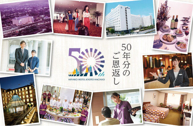 都ホテル 京都八条(所在地:京都市南区西九条院町17)は、1975年に「新・都ホテル」としてオープンし2025年3月25日(火)に開業50周年を迎えます。これを記念し、ホテルの様々な部門から集結したスタッフが一丸となり、特別謝恩企画『ホテル開業50周年感謝祭-50年分のご恩返し-』を開催します。京都の南の玄関口で、半世紀もの時をともに歩んでいただいたお客さま、近隣地域の皆さま、関連協力企業、従業員やその家族への感謝の気持ちを伝えるイベントです。