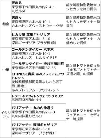 フェアは特別栽培米コシヒカリの美味しさを伝える和食3店舗、龍ケ崎トマトの美味しさを伝える中華3店舗及びイタリアン3店舗の合計9店舗にて開催。都内は丸の内、六本木、渋谷、木場エリアにて、茨城県内においては、あみプレミアムアウトレット内「CHINESE青菜(チャイニーズ チンツァイ)」(阿見町)で実施します。このフェアに先駆けて、POP UPレストラン「リュウガサキッチン コメカトマト」も2月17日(月)、渋谷にオープンしています。