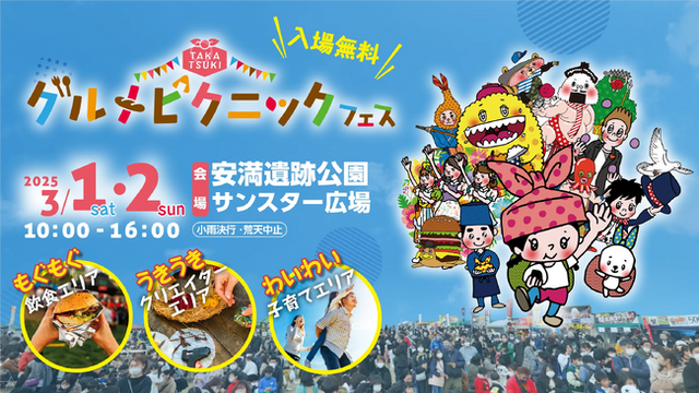 高槻市の安満遺跡公園で、令和7年3月1日(土曜日)・2日(日曜日)、市内人気飲食店を中心に市外飲食店などが並ぶ「高槻グルメピクニックフェス2025」が開催。高槻唐揚げ選手権金賞を受賞した唐揚げ店、ご当地グルメ「うどんギョーザ」のお店、市マスコットキャラクター「はにたん」最中のお店など、市内飲食店を中心に40を超える店舗が集まります。「食」を楽しんだ後は、親子で遊べるエリア、クリエイターの作品が販売されるエリアなどもお楽しみいただける盛りだくさんのイベントです。