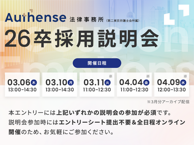 「Focus on Emotions(人の気持ちに、フォーカスする。)」をブランドスローガンとし、法の解決だけではなく、人の気持ちに寄り添い課題解決に向き合うAuthense法律事務所(東京都 港区)が、志を同じくする新たな仲間をお迎えするために、「26卒向け新卒採用説明会」を開催します。