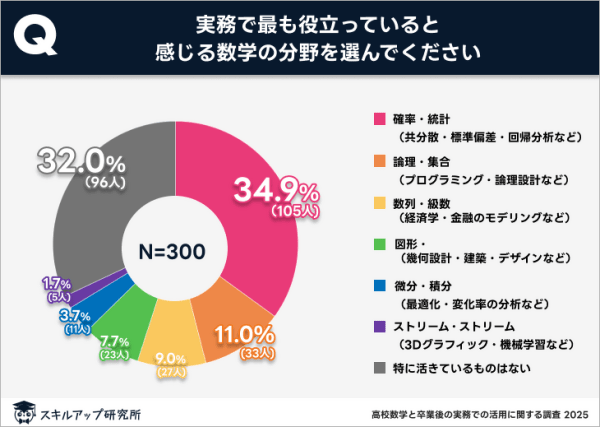 「実務で最も役立つ数学分野」を調査したところ、「確率・統計」が34.9%と最も高い割合を示した。これは、データに基づく意思決定の機会が増えている現代社会を反映した結果といえる。