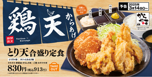 とんかつ専門店「かつや」などを展開するアークランドサービスホールディングス株式会社の子会社、エバーアクション株式会社(本社:東京都千代田区/代表:渡部 貴)は、2025年3月14日(金)より国内の「からやま」にて「とり天合盛り定食」「タルタルとり天丼」を、からあげ縁にて「とり天」を期間限定で販売開始いたします。