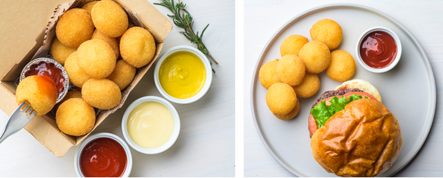 じゃがいもの優しい甘みとモッツァレラチーズのおだやかな塩気とクセのない味わいは、そのままでもおいしくいただけますが、トマトケチャップやディップソースでアレンジするのもお勧めです。また、粉糖やハニーマスタードのような甘みのあるものとの相性もよく、韓国スイーツなどでも人気の甘じょっぱい味を楽しめます。