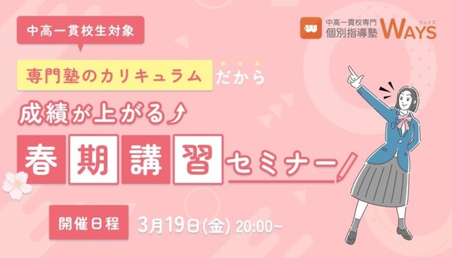 株式会社メイツ(本社:東京都新宿区 代表取締役:遠藤尚範)が運営する『中高一貫校専門 個別指導塾WAYS(以下、WAYS)』では、2025年3月19日(水)に中高一貫校に通うお子さまとその保護者様を対象とした無料の春期講習オンラインセミナーを開催いたします。