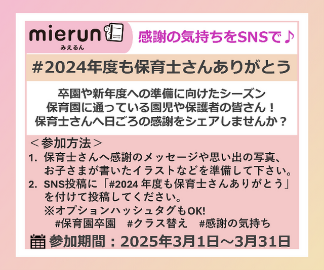 【概要】Instagram、X(旧 Twitter)、Facebook のいずれかの SNS にてハッシュタグ「#2024年度も保育士さんありがとう」を付けて、写真や動画、メッセージを投稿し、感謝の気持ちを伝えましょう!
