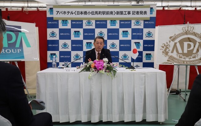 記者発表において、アパグループ社長 兼 最高経営責任者(CEO)の元谷 一志は、「本日、アパホテル〈日本橋小伝馬町駅前南〉の起工式を執り行うことができ嬉しく思う。今回のホテルは中央区で17棟目となる。その中でも小伝馬町・馬喰町エリアでは6ホテル1,190室を運営しており、今回の計画を含めると1,557室となる。アパグループは札幌、仙台、広島、福岡といった政令指定都市において3,000室の客室数確保を目指しているが、今回のホテルをもって中央区だけで約3,000室となることから、ドミナントエリアとして力を入れているエリアだと言える。ドミナント戦略を行うことで満室時のお客様対応だけでなく従業員の育成もしやすくなり、ドミナントエリアを増やしていくことは大切だと考えている。先日発表したアパグループ2024年11月期連結決算では、売上高2,260億円、経常利益796億円という結果になり、2期連続での過去最高売上、過去最高利益となった。目標としている2027年3月末までにホテル客室数を15万室とする計画も順調に推移しており、今後とも『選択と集中』の観点からネットワークを拡大していく。今日は東日本大震災から14年が経過した日であり、当時は仙台市内のホテルで従業員の食料を確保しつつお客様に宿を提供できた。アパホテルは有事でも対応できるよう社会インフラとしての責務を果たしていきたい。そのために無事故無災害で工期通りに工事を進め、地域の皆様に愛されるホテルをつくっていきたい」と述べた。