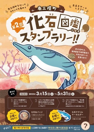 「化石スタンプラリー」は、今年で第2回目となる「化石」×「スタンプラリー」企画です。南三陸町の各スポットを巡ることで、化石から復元された古生物たちのスタンプを集めていくラリーとなります。スタンプブックが埋まった暁には今回限りの「化石図鑑」が完成します。
