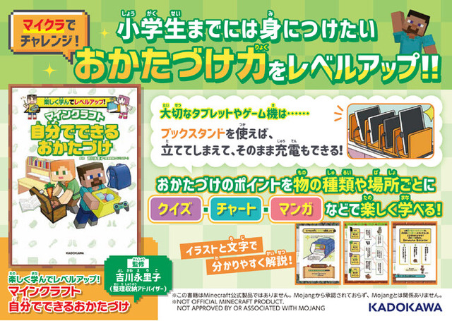 大人気ゲーム「マインクラフト」のキャラクターと一緒に、小学生までに身につけたい「おかたづけ」を楽しく学べる本が登場しました。
