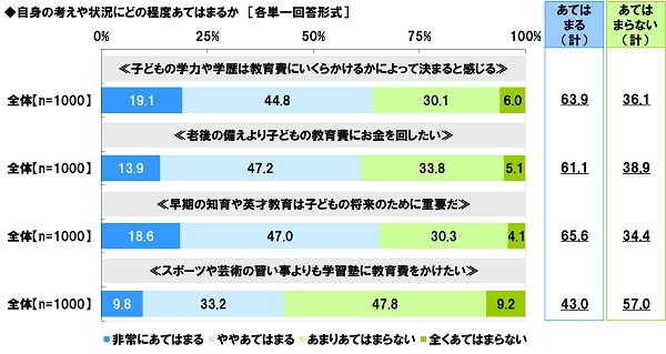 ≪老後の備えより子どもの教育費にお金を回したい≫では「あてはまる(計)」は61.1%、≪早期の知育や英才教育は子どもの将来のために重要だ≫では「あてはまる(計)」は65.6%、≪スポーツや芸術の習い事よりも学習塾に教育費をかけたい≫では「あてはまる(計)」は43.0%でした。(図1)