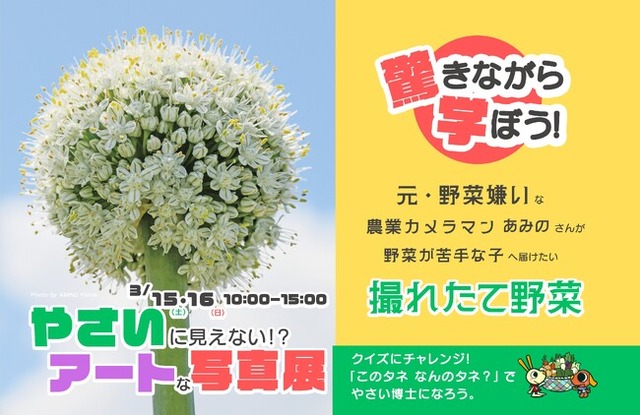 埼玉県・むさしの村で、2025年3月15日(土)~16日(日)に、お子様から大人まで、親子三世代が楽しめるイベント驚きながら学ぼう!「やさいに見えない!?アートな写真展」が開催されます。元・やさい嫌いの農業カメラマン、網野文絵さんによる、すてきなやさいの作品展や、写真絵本『やさいのはな なんのはな?』(岩崎書店)にちなんだ色々な野菜の花の写真や種などが展示されます。その他、会場では、岩崎書店の移動図書館や、クイズラリー、オリジナルグッズづくりなど、イベントが盛りだくさんです。