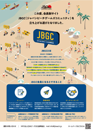 「ジャパンビーチゲームズコミュニティ(以下、JBGC)」とは、海水浴場のオープン時期・ビーチスポーツ情報・ビーチで行われるフェスやイベント情報・海辺地域の避難経路や避難場所等の情報が集約された、ビーチに特化したサイトになります。さらに、ポータルサイト会員者同士による情報交換やマッチング等、「求めあう同志の出会いの場」をつくりソフトを重視したビーチ創生に努めて参ります。