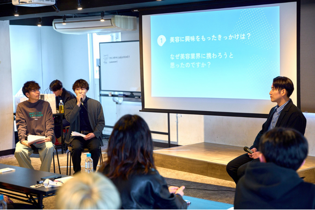 第1部は、実際に美容好きを活かして働く男性社会人3名によるトークセッション。「美容業界に携わろうと思ったきっかけは?」「美容好きを活かせる職業・業種とは?」といったテーマに沿って実体験に基づくリアルなトークを展開しました。