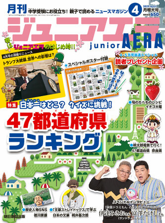 親子で楽しく読めて、中学受験・高校入試の勉強にも役立つ、小・中学生のためのニュース月刊誌ジュニアエラ2025年4月号が、3月14日(金)に発売されました。今号の特集は「クイズに挑戦! 47都道府県ランキングです。今回は春の「増大号」として、「日本の世界遺産」が一目でわかる、ポスター付録つき。豪華読者プレゼント企画もあります。連載「『文豪ストレイドッグス』で学ぶ 日本の文豪」は、梶井基次郎が登場します。