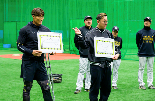 プレミアムラウンジでの昼食を終えて、室内練習場にて野球教室をスタート。阪神タイガースOB選手の糸井嘉男さんと今成亮太さんが登場し、拍手と歓声に包まれました。