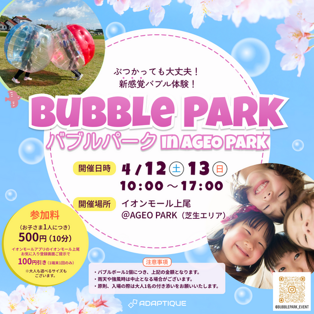 株式会社Adaptique(所在地:東京都品川区、代表取締役:的場 秀)は、親子で楽しめる新感覚のバブル体験イベント「Bubble Park in AGEO PARK」を2025年4月12日(土)・4月13日(日)の2日間限定で開催いたします。会場はイオンモール上尾内の芝生エリア「AGEO PARK」です。