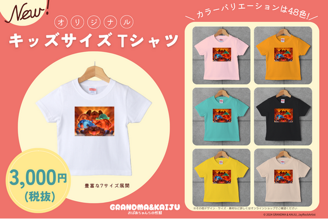 怪獣たちの集合絵・各怪獣たちがプリントされた7パターンのデザインに、48色のカラーバリエーション×7サイズでカスタム注文が可能です。販売中のオーバーサイズと合わせて幅広いコーディネートが楽しめます。