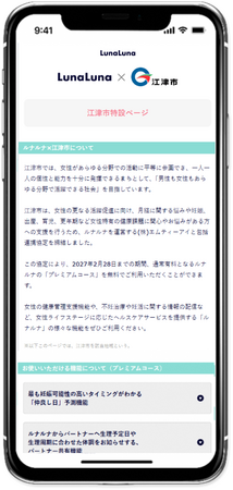本連携協定により、江津市の住民に対し、すべての女性の一生に寄り添うウィメンズヘルスケアサービス『ルナルナ』の有料機能である「プレミアムコース」の無償提供を開始します。『ルナルナ』のサービスを通じて、不妊治療や妊活に関する基礎知識などの情報配信も予定しており、利用者はライフステージに合わせた健康情報を受け取ることができます。