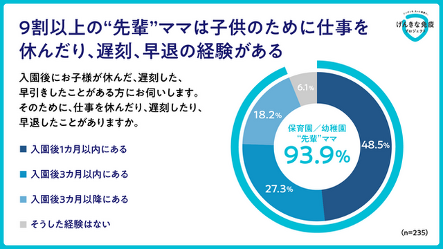 4.入園後に子供の体調不良を理由に、自身の仕事を遅刻、早退、休んだ経験のある先輩ママは9割超(93.9%)、特に入園1か月以内は約5割(48.5%)のママが経験したと回答しました。また「子供の感染症を理由に休んだ際、最長で何日休んだか」という質問に対しては「3~5日」が3割(34.4%)と最も高く、入園後の感染症による子供の体調不良は、ママにも大きな負担となることが明らかになりました。