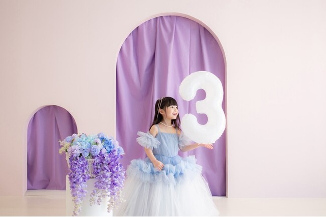 3歳記念は初めての七五三。子供らしさを引き出す『3』のバルーンで遊びながら撮影!お姉さんらしさも、まだまだあどけない表情も写真に残すことができます。