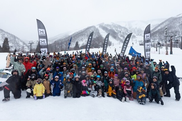 白馬五竜では2年ぶりの開催となったイベント当日は、3歳から57歳まで幅広い年齢層のスノーボーダー総勢158名が集結しました。3月とは思えないような降雪の中、Burtonライダーの中山悠也らがMCで盛り上げながらイベントがスタート。バンクドスラロームでは、参加したスノーボーダー全員が、楽しみながらも自らのベストを尽くすべく、特設コースをプッシュしていました。パークエリアでは、Burtonライダーの片山來夢、高橋龍正、竹内悠貴らが、スタイリッシュなエアで会場を沸かせつつ、パークを楽しむ参加者にBurtonグッズをプレゼントしたり、一緒に写真を撮るなどして、和やかな会場の雰囲気を作っていました。