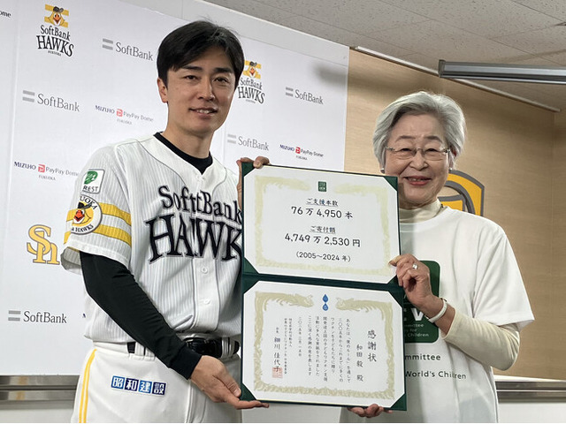 福岡ソフトバンクホークスの和田毅投手が2005年から継続して行なっている、開発途上国の子どもたちに感染症のワクチンを支援する活動。2024年もスペシャルサポーターとして活躍する「認定NPO法人 世界の子どもにワクチンを 日本委員会」(以下:JCV、本部:東京都港区)を通し、ミャンマー、ラオス、ブータン、バヌアツの4カ国の子ども達に29,830本分(金額にして2,232,700円)のワクチンを支援。先日、3月15日(土)に行われた引退記念試合で、ユニフォーム姿での最後の感謝状贈呈式を実施いたしました。