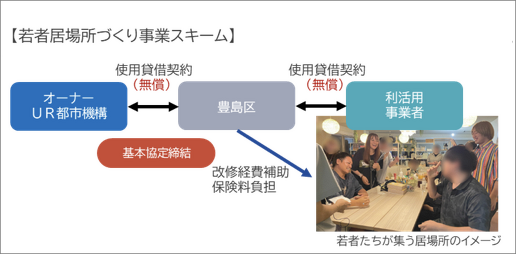 豊島区が実施する「若者の居場所事業」は、UR都市機構の所有する防災街区整備事業用地内の土地・建物を区が無償貸借し、さらに若者支援団体に無償で転貸借をして運営、若者の居場所を創出する事業です。