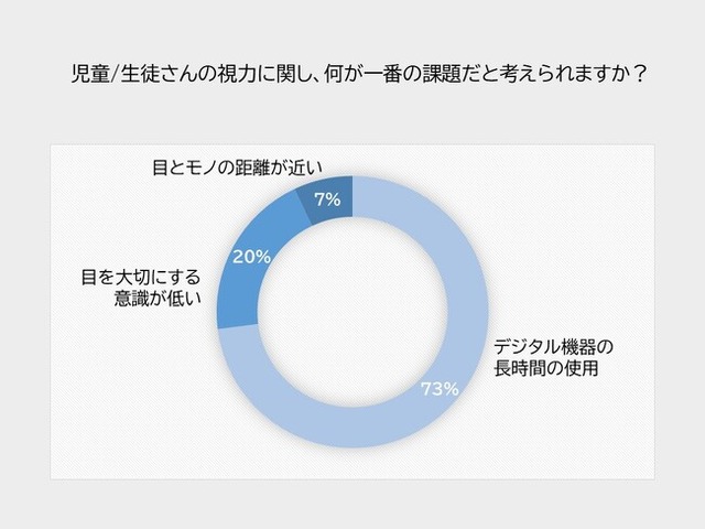 オーストラリアのブライアン・ホールデン視覚研究所の調査結果によると2050年までに世界人口の半分は近視になると推計されています。日本も例外ではなく、文部科学省が発表した「令和5年度学校保健統計」(*1)によると、裸眼視力1.0未満の小学生の割合は全国で37.79%、中学生では60.93%であり、前年の過去最高値より改善されたものの、依然として高い割合が続いています。近視人口の増加の理由のひとつにデジタル機器の普及により近くを見る時間が長くなったことがあげられます。実際、出前授業を実施した学校にアンケートをおこなったところ、7割以上の教員が「デジタル機器の長時間の使用」を最重要課題だと考えています。