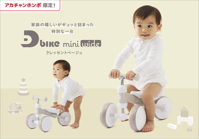 ディーバイク ミニ ワイドの魅力はそのままに、長年に渡り子育てに寄り添い応援してきたアカチャンホンポの知見を反映させた特別な三輪車『ディーバイク ミニ ワイド クレッセントベージュ』。