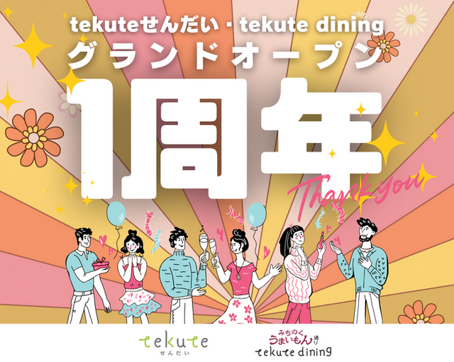 また、tekuteせんだいの飲食エリア「tekute dining」は、開業1周年。東北の美味しいお食事やお酒をお届けしたいという想いを込めて「みちのくうまいもん通り」の愛称を加え、これを記念したさまざまな特典サービスを各店舗でご用意しています。