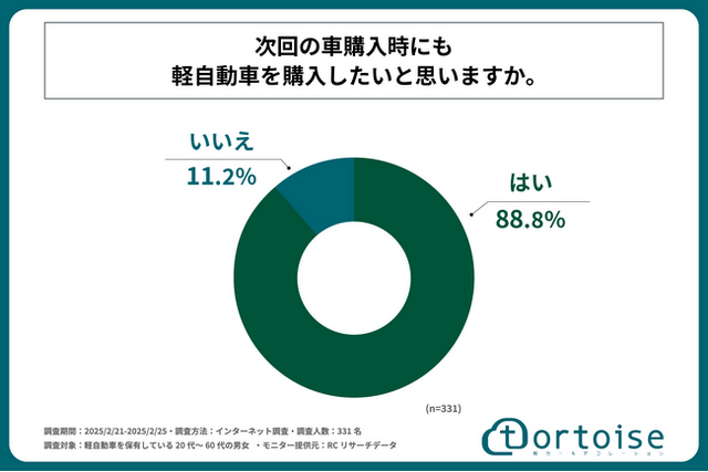 調査の最後、「次回の車購入時も軽自動車を購入したいと思うか」を問う設問への回答では、「はい」が88.8%、「いいえ」が11.2%という結果になりました。この結果から、軽自動車ユーザーの約9割が、次回の車購入時も軽自動車を購入したいと考えていることがわかりました。