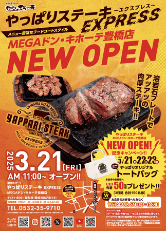 愛知県豊橋市にやっぱりステーキEXPRESS MEGAドン・キホーテ豊橋店が3月21日(金)にオープン致します。