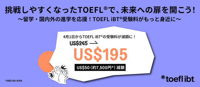 TOEFL(R)テスト日本事務局 / ETS Japan(所在地:東京都千代田区、カントリーマネージャー:根本斉)とその親会社であるETS(米国ニュージャーシー州プリンストン)は、留学や国内外の進学を目指されている日本国内の受験者を応援するため、留学先出願、大学・大学院入試、単位認定、教員・公務員試験、国際機関の採用、レベルチェックなど、英語力の証明として幅広いシーンで活用されているTOEFL iBT(R)の受験料を、現在の US$245 からUS$195 に改定(US$50減額)することを決定いたしました。TOEFL(R)を通じて一人でも多くの方の未来が広がり夢を実現できるよう、スタッフ一同、受験者の皆様を全力で応援しています。