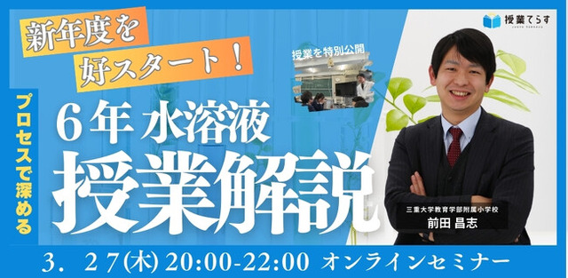 本セミナーでは、三重大学教育学部附属小学校の前田昌志先生を講師に迎え、「小学校6年生理科「水溶液」」を題材にした授業を公開。子どもたちが主体的に学び合う授業の作り方を、実際の授業映像を見ながら学ぶことができます。さらに、参加者同士の交流を通じて、全国の先生方と意見を交わしながら、より深い学びを得ることができます。