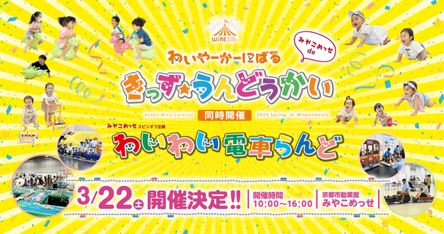 京都市勧業館みやこめっせにて、2025年3月22日(土)に、赤ちゃんから未就学のお子さまとそのご家族さまを対象にした子育てファミリー体験型イベント「みやこめっせ de わいやーかーにばる〈きっず★うんどうかい & わいわい電車らんど〉」を開催いたします。