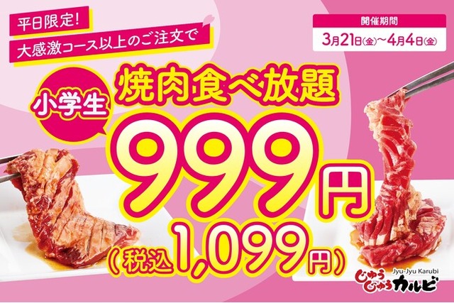 株式会社トマトアンドアソシエイツ(本社:兵庫県西宮市、代表取締役社長:小林 大二)が運営する、焼肉食べ放題「じゅうじゅうカルビ」では、2025年3月21日(金)~ 4月4日(金)の平日限定で、小学生の食べ放題料金を999円(税込1,099円)にてご提供いたします。