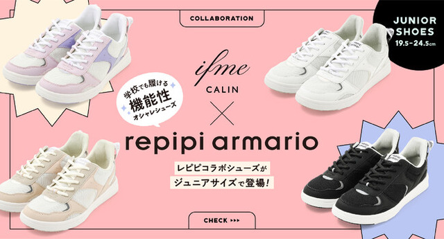ジュニア世代の子供たちから大注目の人気アパレルブランド「repipi armario」とIFMEのコラボスニーカーが登場します。IFMEでは初のジュニア向けブランドとのコラボレーションとなる今作では、“かわいいをシェアする”をコンセプトに展開するIFMEのサブブランド「ifme CALIN(イフミーカラン)」のジュニアシューズをベースとしたコラボスニーカーを発売。カラーは、ホワイト・ベージュ・ブラック・パープルの4色で、シンプルながらもキュートなデザインに仕上げました。アッパーにはifme CALINでは初となる「紐靴タイプ」を採用し、シューレースやアクセサリのカスタマイズも可能になっています。
