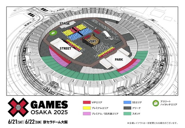 「X Games Osaka 2025」では、アリーナ観戦(=グラウンド)で世界トップクラスのパフォーマンスを間近で体感できるのはもちろん、すべてのチケットでスタンド席での観戦も可能。迫力あるプレーを目の前で楽しむか、スタンドからじっくり観戦するか、自分に合ったスタイルで大会を楽しめます。