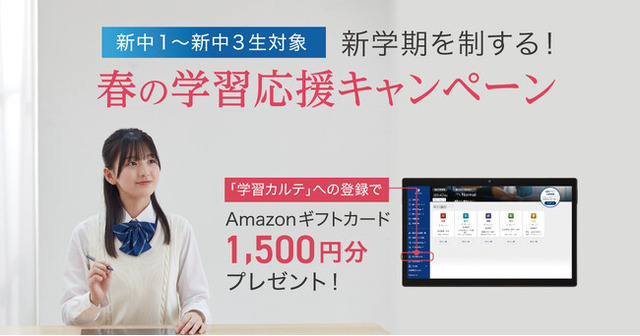 入会後に学習アプリ内の新機能「学習カルテ」に登録いただいた方に、Amazonギフトカード1,500円分をプレゼント。“春から新しい学習を始めるあなた”を応援します。